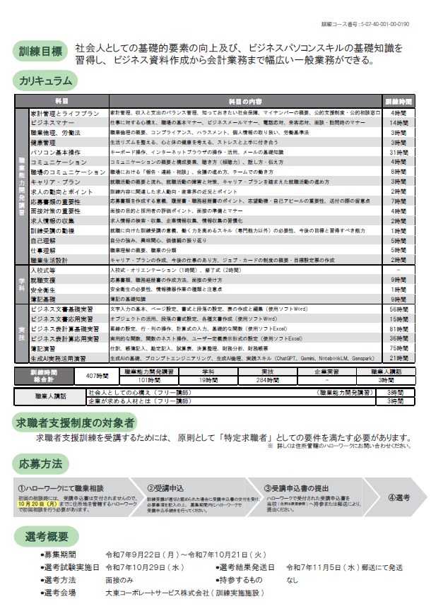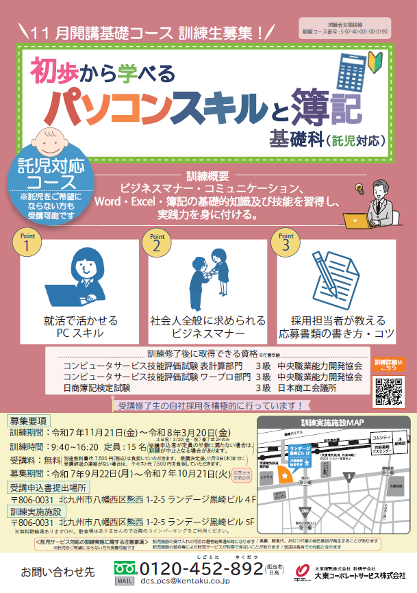 大東コーポレートサービス(北九州事業所)では、求職者を対象に「事務スキル」、「PCスキル」の習得を目指した職業訓練事業を展開しています。